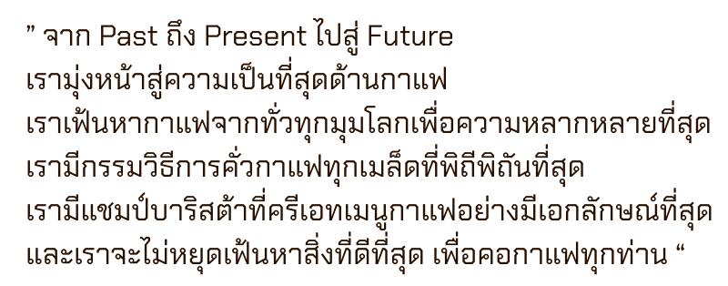 ทางร้านได้เลือกเฟ้าหาสิ่งที่ดีที่สุด จากสิ่งที่รัก มอบให้กับคนรักกาแฟ ที่เข้ามารับบริการที่ร้านทุกท่าน ทุกเมล็ดกาแฟ ทุกสายพันธ์ุที่มี จะผ่านกรรมวิธีการคั่วอย่างพิถีพิถันสุดๆ ผ่านการคิดค้นกับเมนูที่เป็นเอกลักษณ์ ประกอบกับความตั้งใจและใส่ใจทุกขั้นตอน เลยเป็นอีกหนึ่งแลนด์มากร์กสำคัญ แห่งใหม่ของคนรักกาแฟไปแล้ว