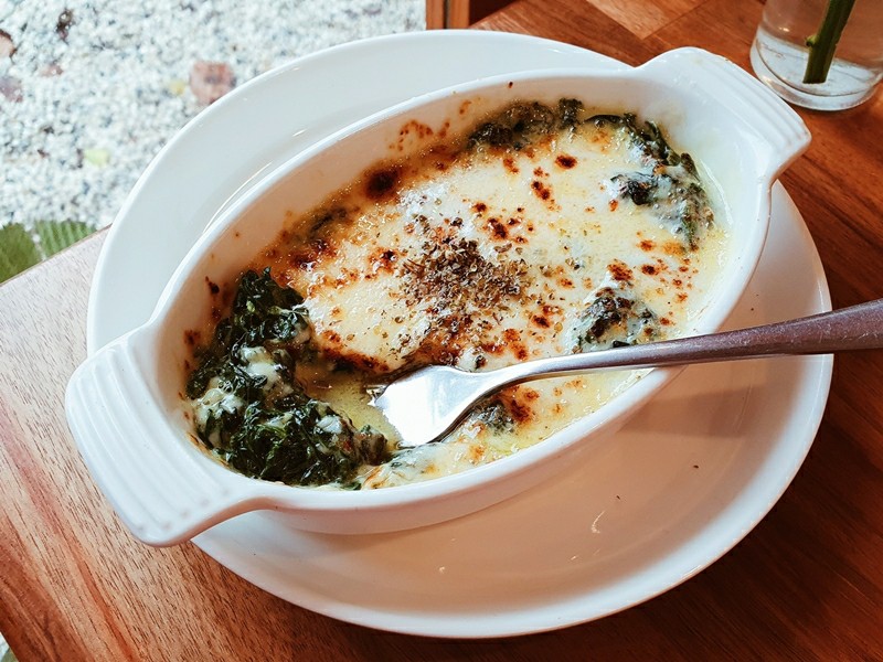 และอีกหนึ่งเมนูของที่ร้าน ที่ได้รับความนิยม บอกเลยว่าใครที่มาร้านนี้ จะต้องลองเมนู ผักโขมอบชีส (125 บาท)  เป็นเมนูที่อร่อย ผักโขมเน้นๆ เข้ากับชีสเยิ้มๆ รสชาติอร่อย เข้มข้นกำลังดี